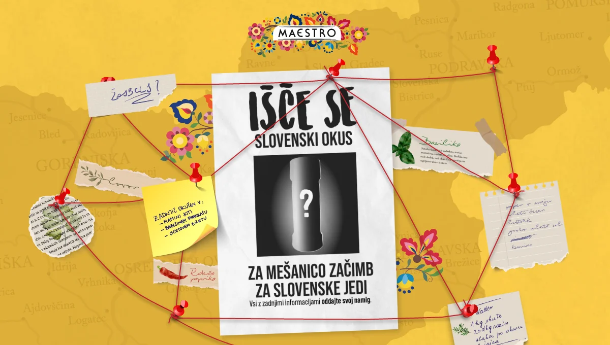 Znamka Maestro, znana po svojem strokovnem poznavanju začimb, se je odločila, da mešanico, ki bi nam morala biti najbolj domača, spravi v domove vseh Slovencev. Maestro zato zdaj išče pravi slovenski okus, ki bo navdahnil edinstveno mešanico začimb za slovenske jedi.