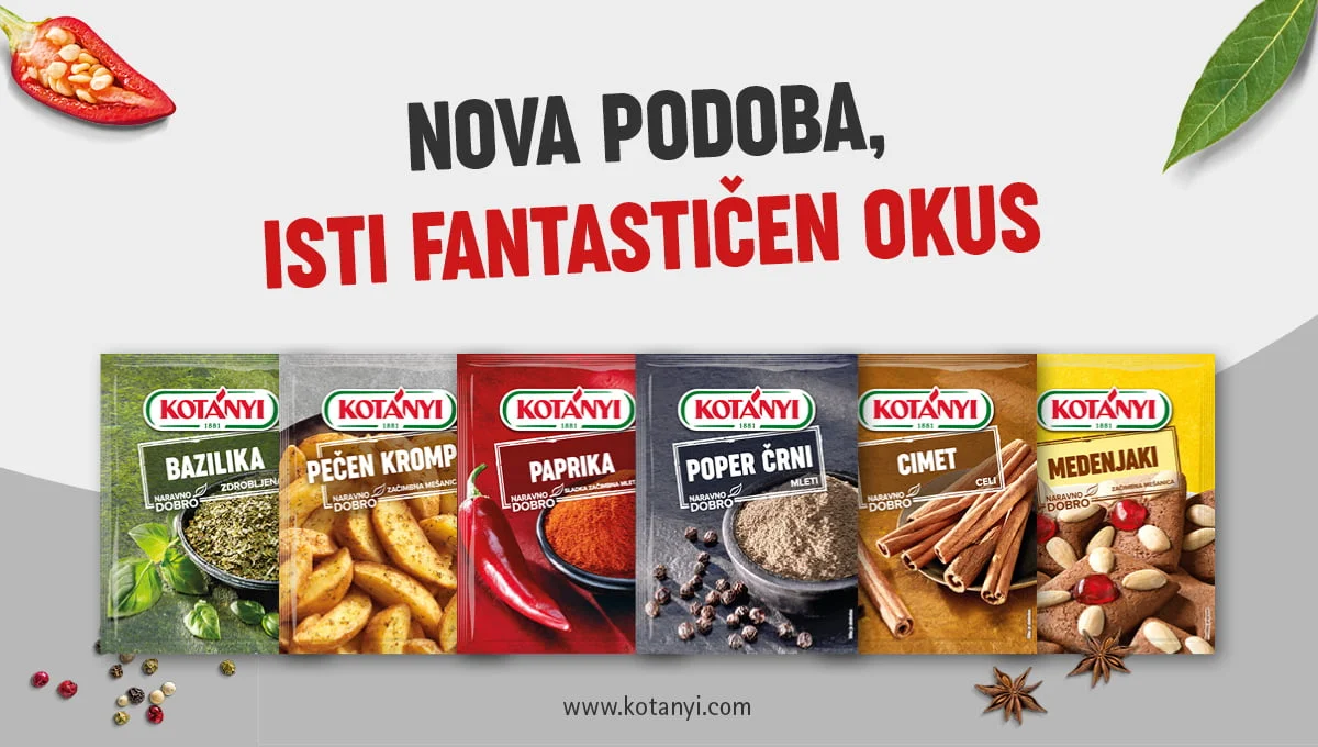 Prenovljena podoba vrečk izraža bogato zgodovino blagovne znamke in hkrati nagovarja sodobnega kupca. Ohranja barvno kodiranje po segmentih, s katerim so v podjetju Kotányi že ob prejšnji prenovi ponudili orodje za enostavnejšo orientacijo in prepoznavnost pred polico in tako pripomogli h krajši nakupni poti.