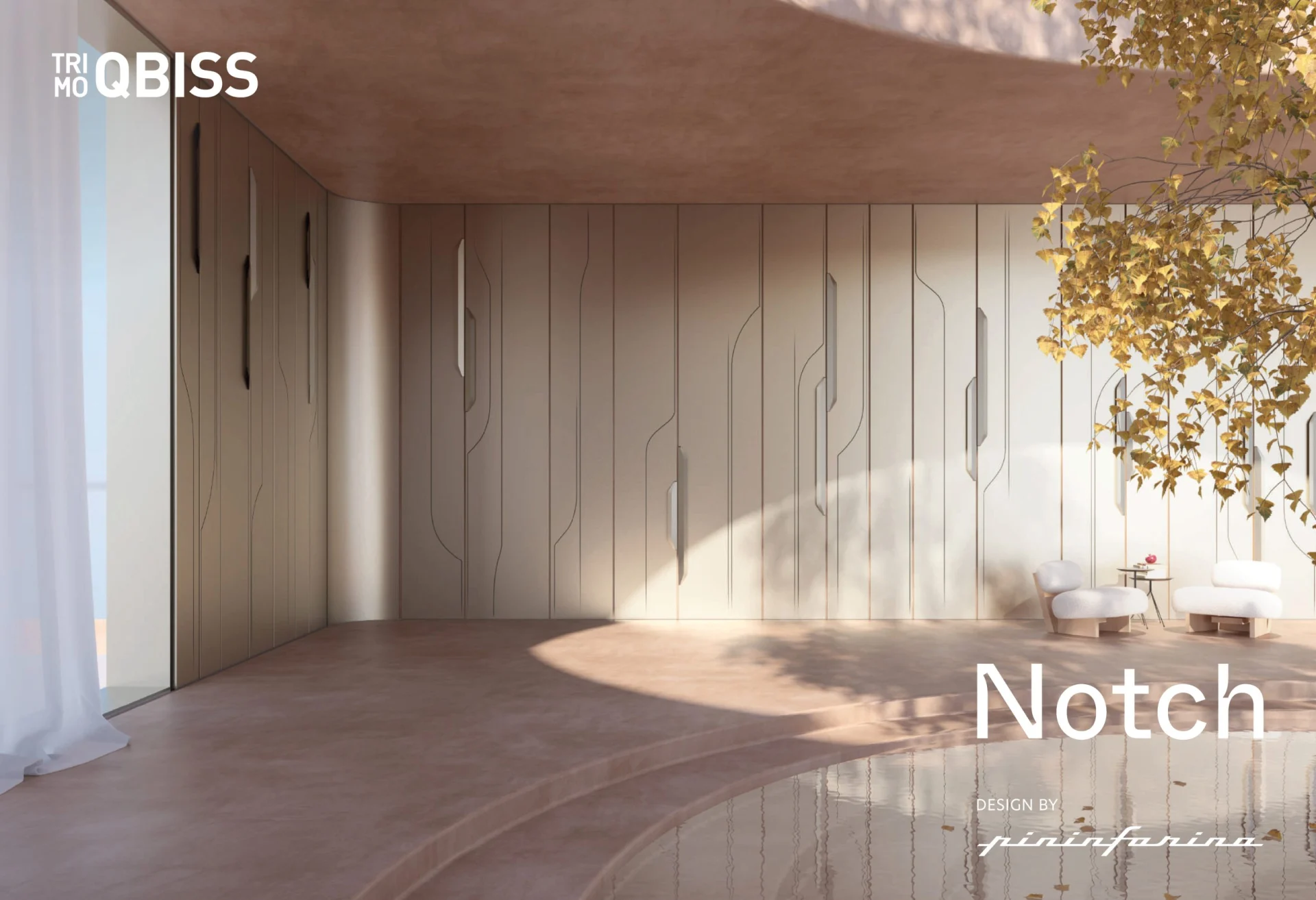 Sistem Notch Wall je oblikovalska nadgradnja dovršenega Trimovega produkta Qbiss. Gre za pionirski sistem oblikovanja, ki prilagaja elemente Qbiss s tremi temeljnimi komponentami: vsestranskimi navpičnimi elementi, edinstveno grafično igro krivulj in glifov ter modularnim vtičnikom “wing” za dekoracijo in osvetlitev. Ta inovativni sistem izboljša arhitekturno estetiko in odraža Trimovo inženirsko moč in Pininfarinin oblikovalski pridih.