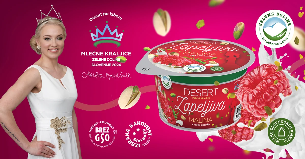 Predstavlja se najnovejši biser iz pestre ponudbe mlečnih izdelkov Zelene Doline – jogurtova smetana, DESERT mlečne kraljice. V sebi nosi osvežilen okus zapeljive maline s koščki pistacije in z vsako žlico se občuti preplet okusov, ki je pravi raj za brbončice.